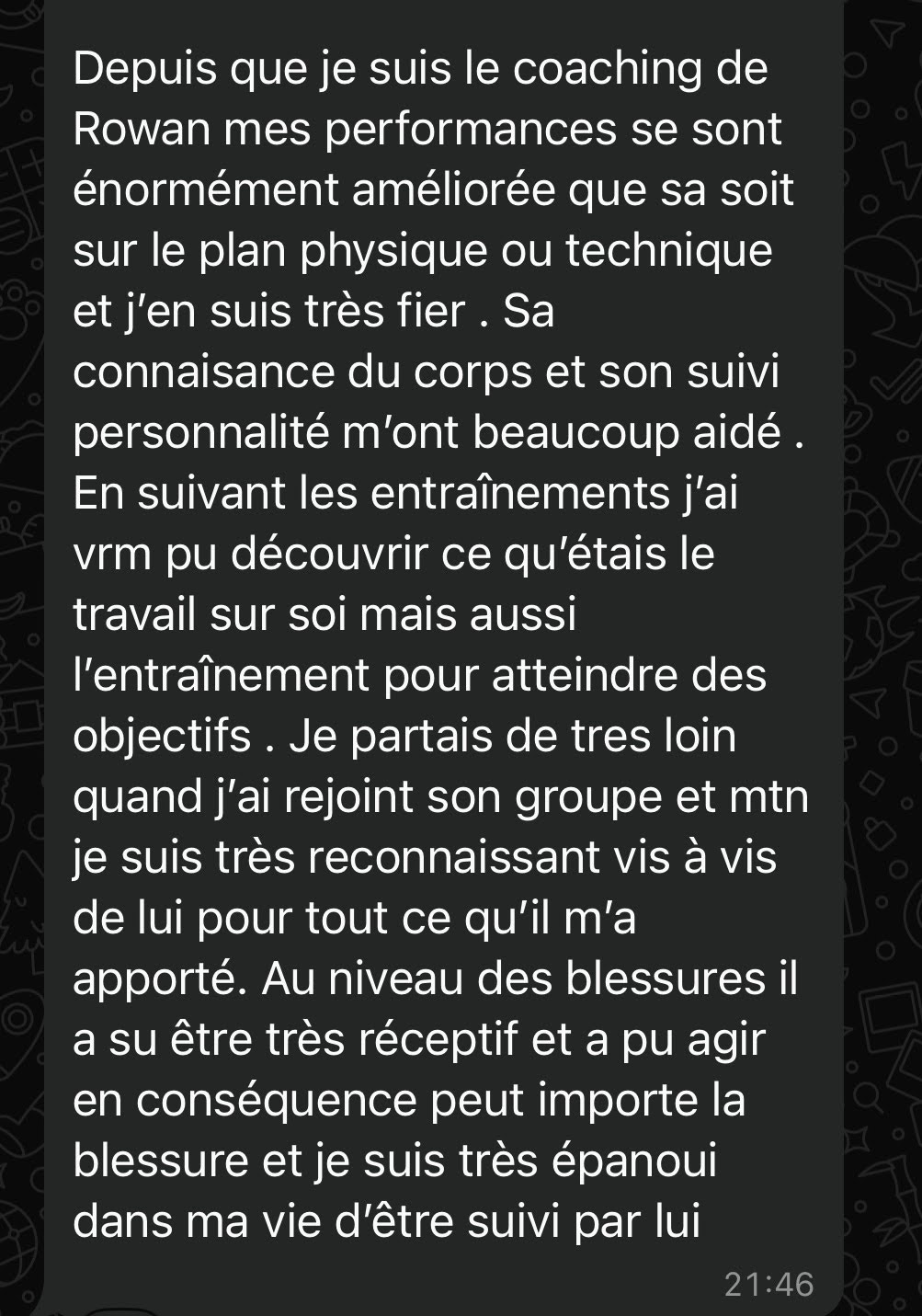 “Cela fait maintenant 4 ans que Rowan est mon préparateur physique et qu’il s’occupe de mes séances personnalisées. Celles-ci s’adaptent parfaitement à mes plannings et m’ont permis une constante progression ces dernières années, jusqu’à atteindre le top 200 mondial et le top 15 français dans ma discipline.”
